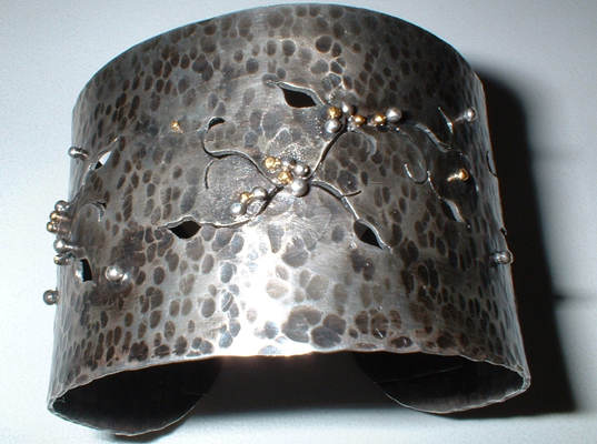 Handcrafted with Sterling Silver and 24k gold detail. Negative space metalwork of leaves, vines & clustering of Sterling Silver and 24kgold berries add lots of drama! . This striking cuff comes in two finishes and is two inches wide.