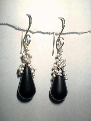 One of the lightest and naturally black semiprecious gemstones is jet. This satin looking stone is set with a crown of caviar. Very classic.