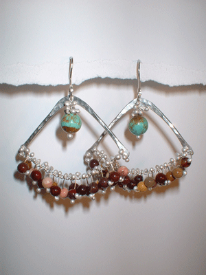 Moukaite Jasper and Turquoise are unusually beautiful together. These earrings are eye candy at approximately two inches long. Yummy!