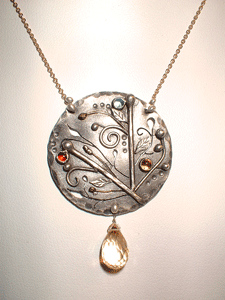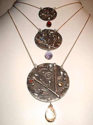 Handmade intricate metalwork of vines, berries & leaves adorn these delicate necklaces. Sterling Silver, 14k gold & Copper are used to create these little works of art. The medium and large pendants are set with three gems and each are 3mm. The smaller pendant has one gem set in the center that is also 3mm. In love with a particular gemstone? Custom orders are welcomed.
