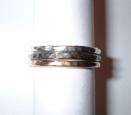 Each ring is hand fabricated in Sterling Silver and 14kgold-filled alloy. One ring is oxidized Sterling Silver(blackened), making the set a funky and fresh new way to stack pieces with your own rings!